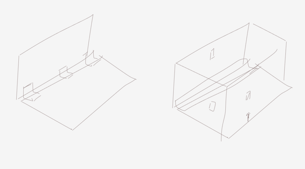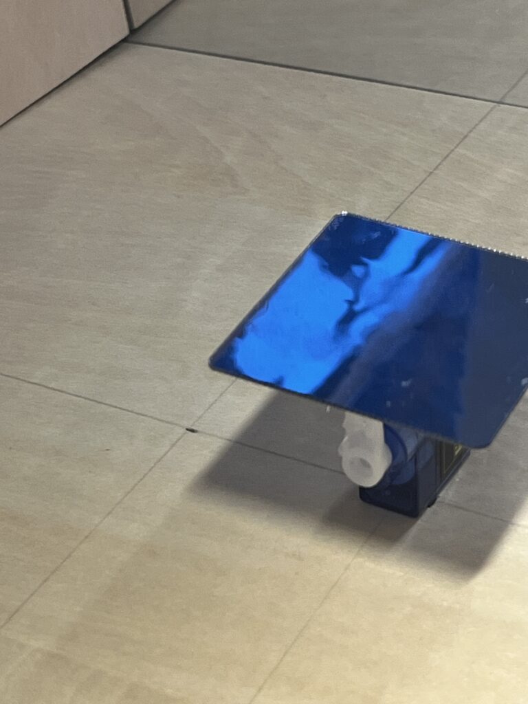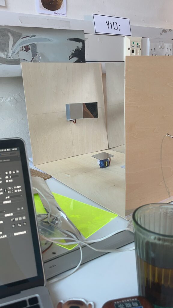 Returning to my primary research section, my original conception was that the entire apparatus should be a flat plane. I could mount all components (mirrors, servos, etc.) horizontally upon it, but I realised I preferred observing both the reflected patterns and the light’s path. Moreover, three-dimensional space actually facilitates light propagation better than a flat plane (a point I recognised after revisiting some high school physics). A flat surface would block roughly one-third of the light source and render it uncontrollable. Consequently, I swiftly abandoned my initial concept and endeavoured to construct it in three dimensions.