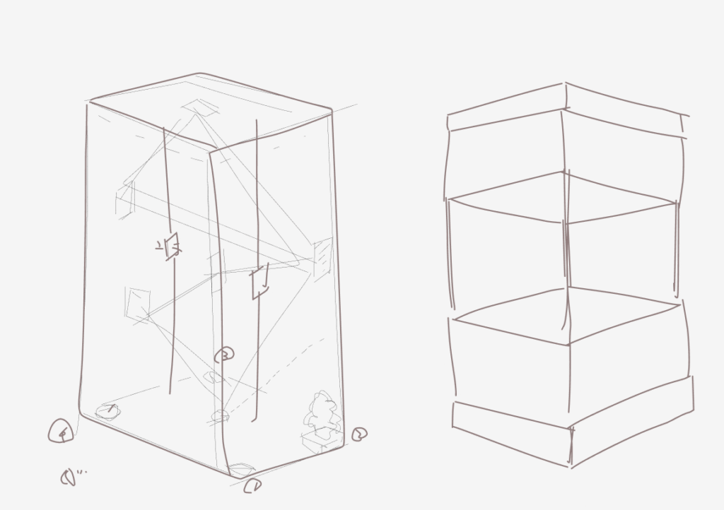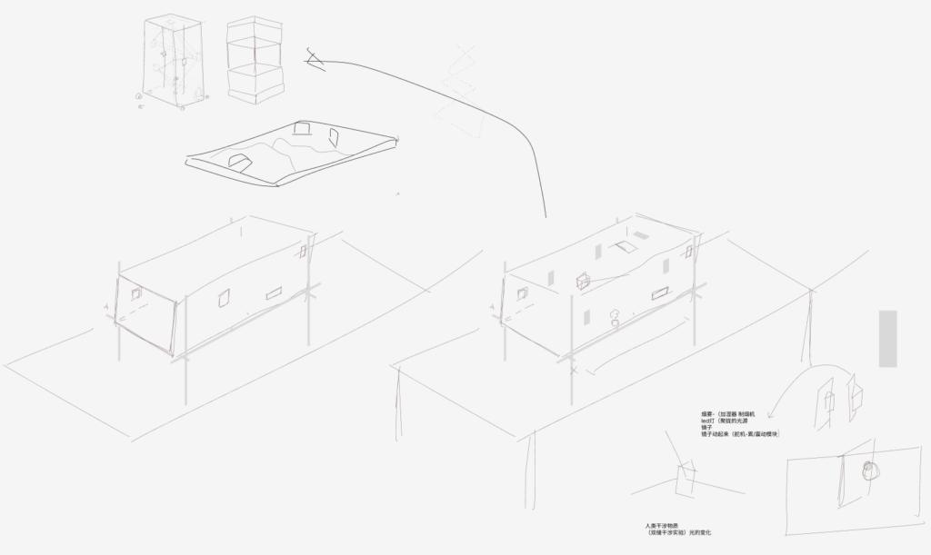 I transformed it into a fully enclosed design, more akin to a “glowing box”. I shall continue developing the design based on this composition. In truth, I’d rather call it a “kaleidobox” – much like a kaleidoscope, one observes it to behold the beautiful patterns drawn by light within. Delving deeper into the design, I initially intended it to be a box that could open and close, or have transparent sides, but this always felt somewhat impractical. Consequently, I revised these aspects. I will incorporate small windows on the front of the box, allowing observers to glimpse the interior scenes from different angles through these apertures. This approach also minimises the environmental impact on the installation. Multiple internal light sources could be employed, each emitting distinct colours from varied angles. Simultaneously, I have a brilliant concept: light would manifest within specific mediums. Thus, I could fill the box with artificial smoke, allowing observers to visibly trace the paths of light as it propagates. As for the positioning of the mirror and servo motor, along with the acrylic colour paper, I still need to conduct some research to determine the optimal angle and orientation.
