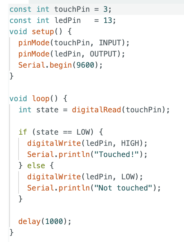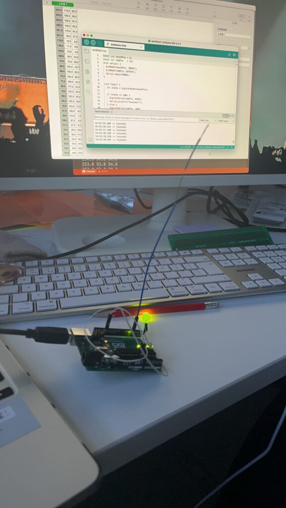 Now, I need to commence some experiments. I must select a suitable “medium” for touch detection and test their conductivity. Before proceeding, I require a brief refresher on Arduino methods for testing wire readings. I stripped one end of a wire, made a simple connection to the Arduino board, and wrote a short piece of code. The fundamental principle involves using the Arduino to detect whether an external wire is being touched by a human hand (detecting changes in human body capacitance), then displaying these changes via an LED or serial port output. When touching the exposed copper wire section, I could observe the readings change. However, this code is far too brief, with too many factors influencing the readings, so it cannot serve as the final code for testing connectivity. Still, it did help me review the underlying principles of this process.