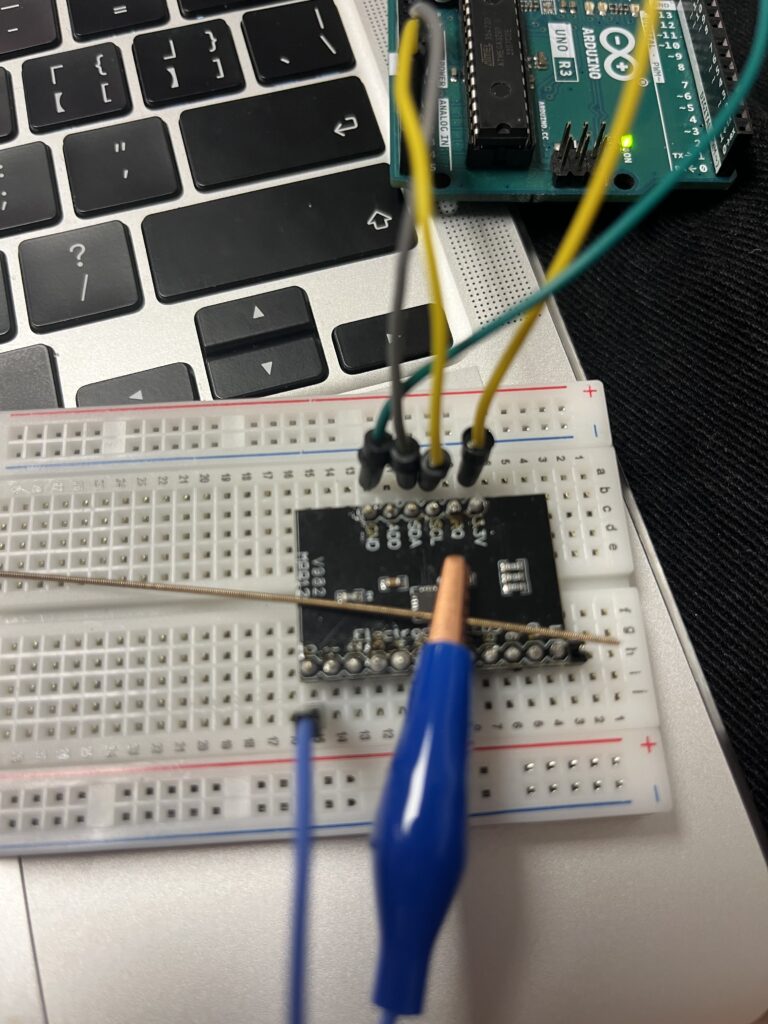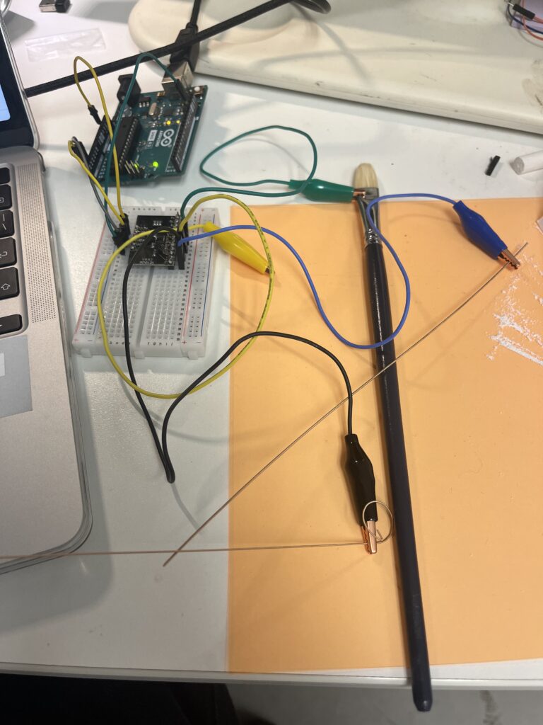 Today I continued with further testing. I brought along some entirely new materials—a few old guitar strings—and significantly optimised the code. Guitar strings, like the copper wires in jumpers, are conductive yet offer greater convenience and stability. Simultaneously, I realised it was unwise to directly use the Arduino to detect ‘current changes’. This may sound counterintuitive, but it simply isn’t how it operates. Attempting to measure current directly yields virtually no meaningful data. The human body acts as a natural capacitor and electric field coupling. Therefore, my sole requirement is to test whether this wire (or guitar string) has been touched. Before proceeding with these experiments, I must clarify that my objective isn’t merely to test the material’s ‘connectivity’—otherwise, I’d have simply used a multimeter and been done with it. My purpose is to obtain specific data, or rather, to determine what I can call upon in the future.