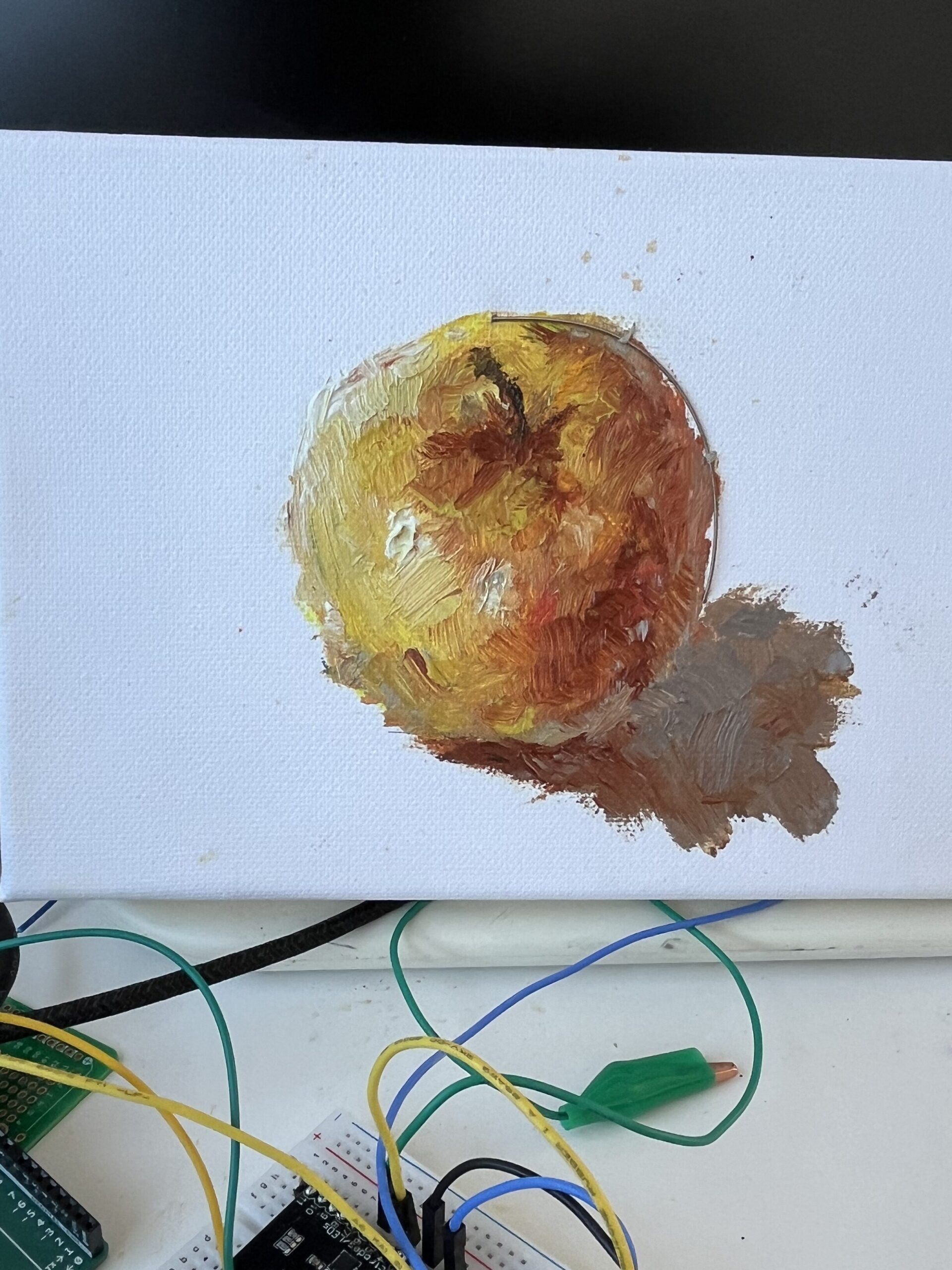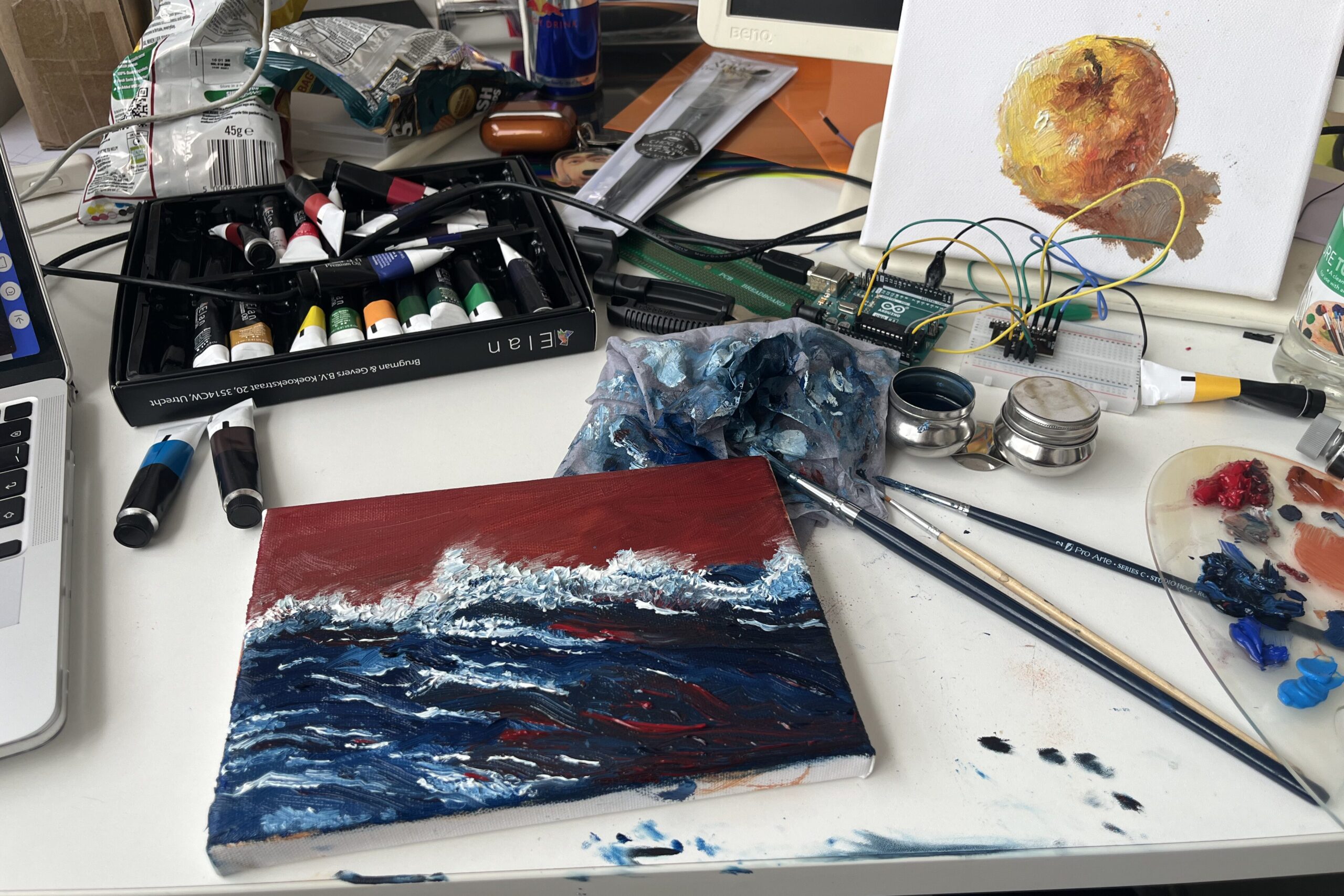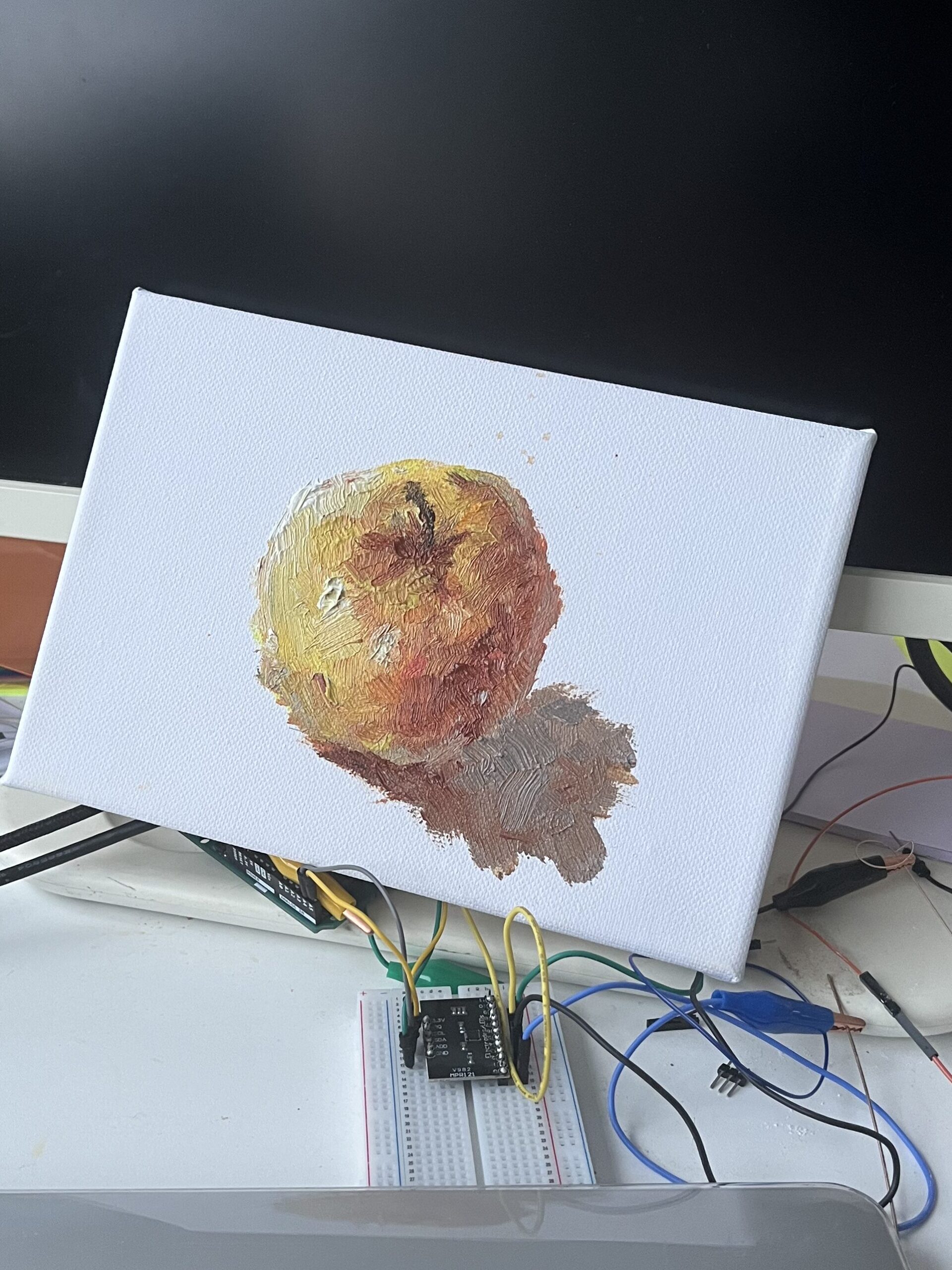 I cut the guitar strings into small segments and embedded them into the paintings, securing them with needle and thread. What strikes me as truly remarkable is how seamlessly these guitar strings appear to blend into the artwork—perhaps due to the brass texture, or the verdigris patina upon them, who can say? I allowed a small section to protrude from the reverse side of the paintings, enabling me to clamp them with crocodile clips and connect them to the Arduino board.