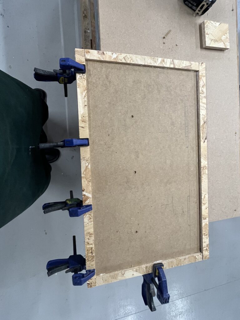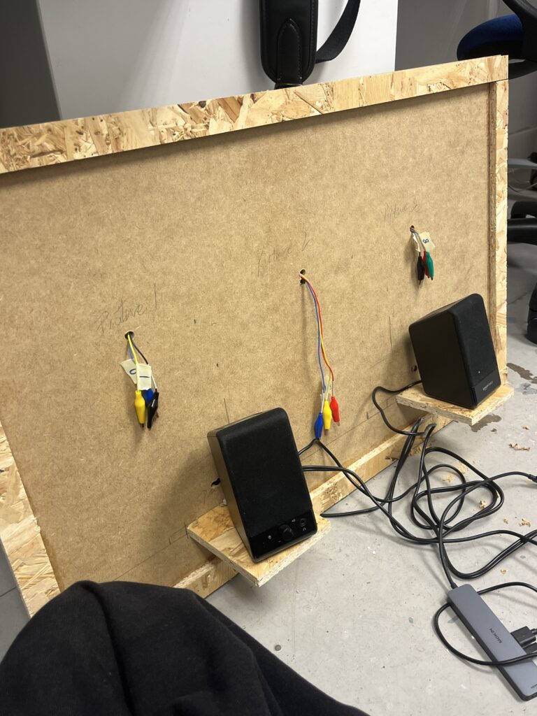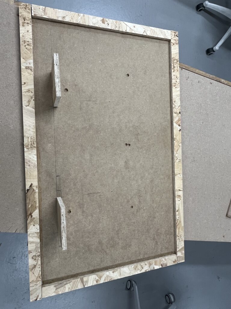 I began contemplating how to construct a suitable platform to support all the equipment, images and cables for this project. Or rather, how I should present it if I were to exhibit it. I planned to make a picture frame incorporating my three images and two speakers, with all the cables concealed behind. On Wednesday, I visited the Woodenwork workshop at Reid and spent some time constructing this picture frame. Unfortunately, most of the workshop’s machinery and electric saws were out of order that day, so I could only perform basic tasks with a hand saw. The finished frame wasn’t particularly pleasing to the eye, but it was the best I could manage at that stage. I completed the front section and two wooden platforms to support the speakers, drilling holes for the cables to pass through. I brought the finished piece back to the studio. Before assembling it, I need to complete one final step: attaching some felts. These black felts are akin to the acoustic foam you’d affix in a rehearsal room. In my future vision, this frame will be larger, requiring ample space at the rear to accommodate all the equipment and gear. This will inevitably create some excess space and voids. These speakers generate significant audio resonance when active, and I didn’t want them to vibrate the entire structure or produce unwanted echoes. The black felts help minimise interference while focusing the sound forward—towards the audience.