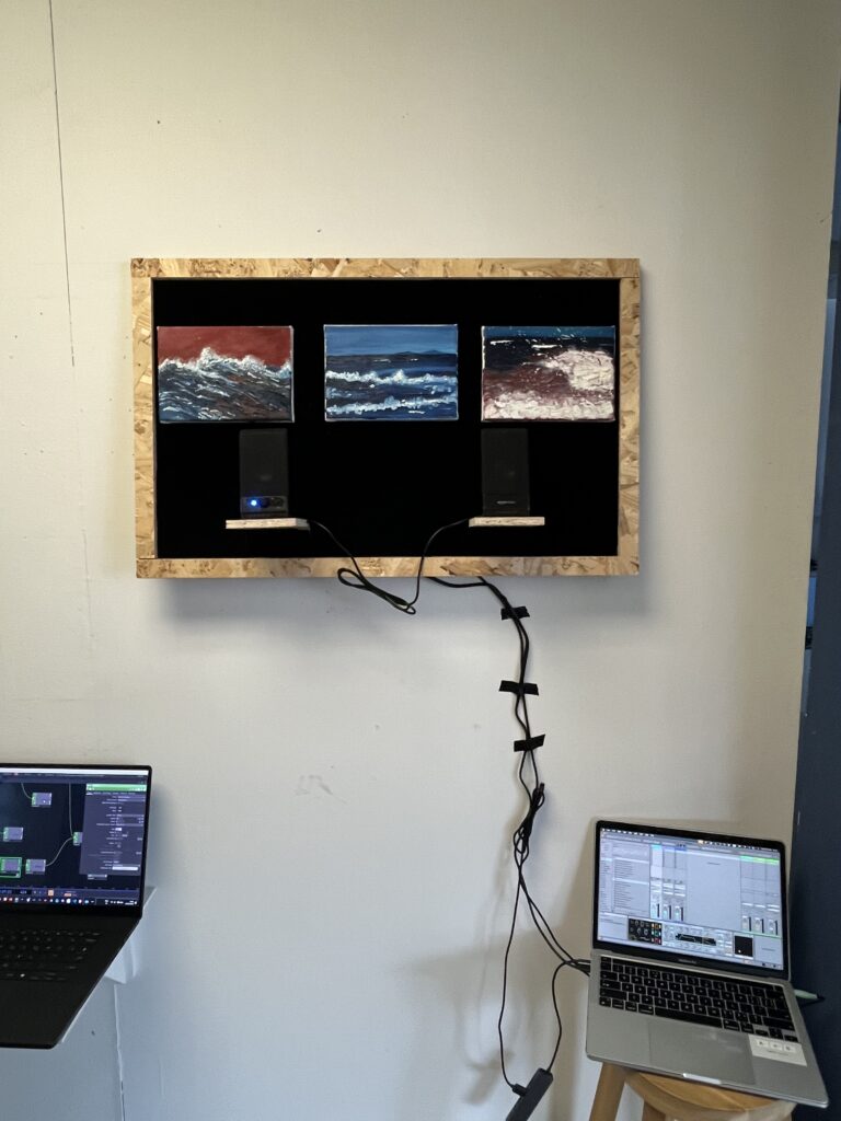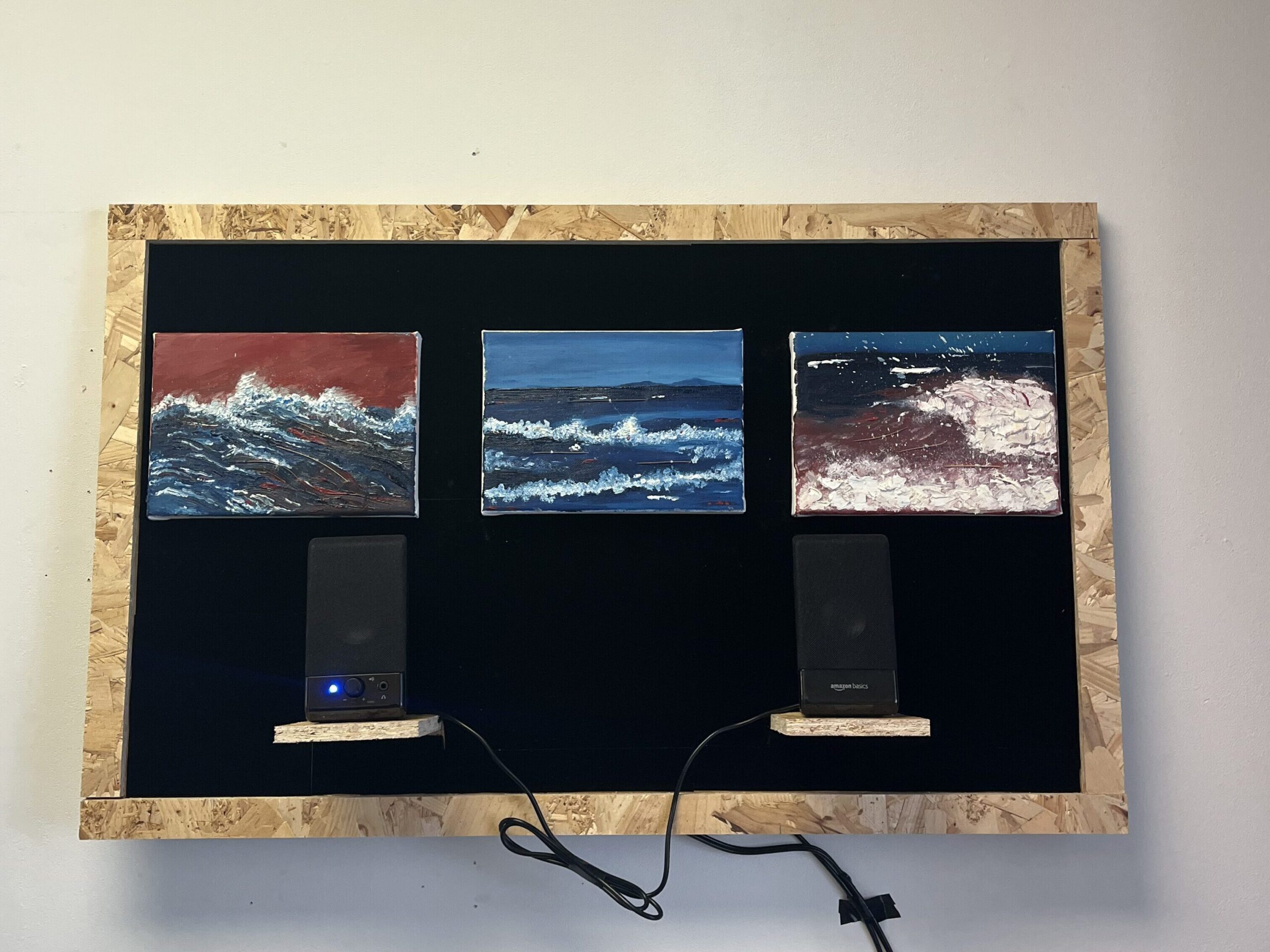 But to be honest, I’m not particularly fond of the picture frame concept. It feels like it’s constraining the entire project—I dislike such rigid boundaries. I feel that the material of these wooden panels and the placement of the speakers create distractions for the audience, forcing me into a lot of pointless overthinking. I wish it could simply appear cleaner and more straightforward. Perhaps only these three paintings should be hung on the wall? Time is limited, and this is the best I can manage for now, but at least it allows me to experiment with some ideas. I need opportunities to learn through trial and error.