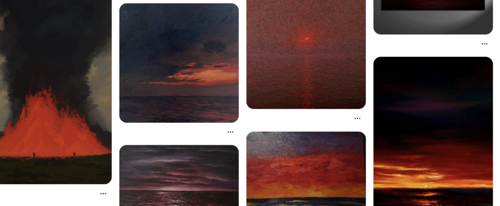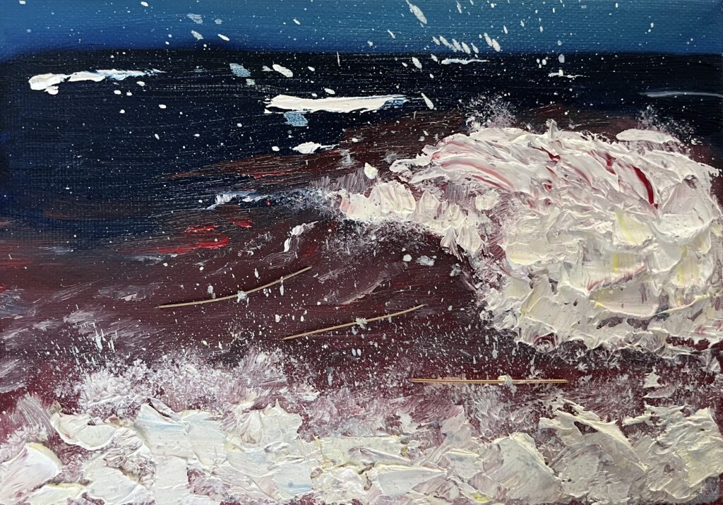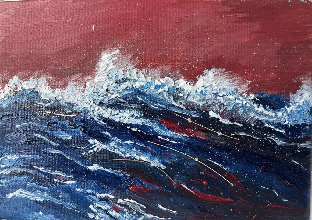 Regarding these paintings, personally, I wish to depict something engaging. I do not want them to be tedious, merely stacking colour blocks to pander to the central theme of colour transforming into sound. To some extent, I want them to be a little “jarring”. I hope the viewer first “sees” this work, and only then “feels” it. The image serves the work itself, yet it should not be an accessory. I gathered much inspiration from Pinterest, using keywords like ‘burning, boiling, waves, desolation’. These were my earlier reflections; whenever I discussed them, the sights and sounds I’d witnessed would materialise in my mind and leap onto the paper. For me, many things—life, purpose, obsessions—blend into a landscape of desolation, and at the edge of this desolation lies a boiling sea.