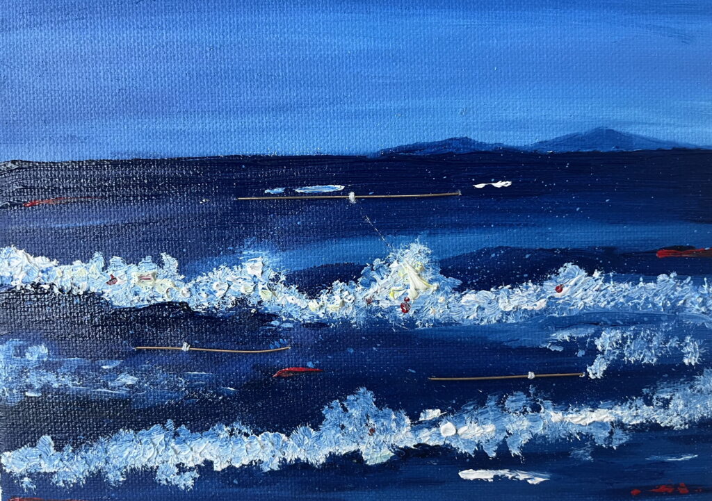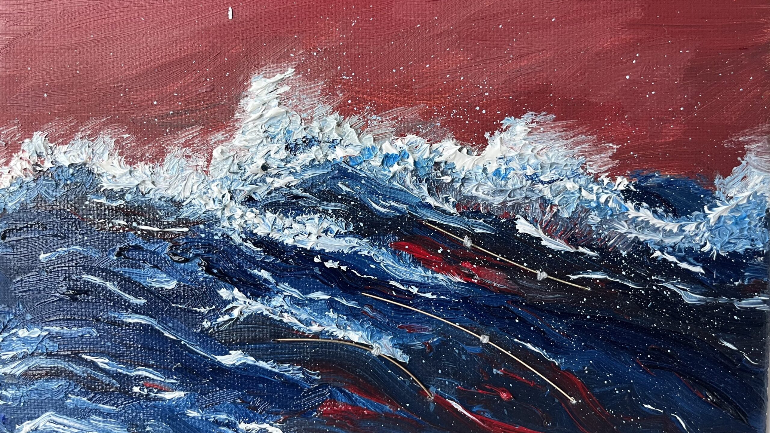 I chose to maintain a high degree of thematic and chromatic consistency across these three paintings because I wished for sound to be the true variable. Given that my research centres on the realm of sound, I felt it necessary to constrain visual variables to prevent them from overshadowing the subject. Had I employed entirely different themes, viewers would have been distracted by the pictorial narrative. Similarly, at the data level, employing similar colours across these three paintings allows me to obtain more closely aligned colour data. This implicitly constrains variables, enabling me to focus attention on the data itself. I can then analyse their relationship to sound from various angles represented by RGB and HSB – rhythm, frequency, spatiality, distortion, and so forth. From a curatorial perspective, this design imbues the work with structural coherence, enhancing the viewer’s immersion. (I shall certainly exhibit it.) By introducing subtle variations within these three images—such as the ratio of red to blue, the degree of fragmentation versus concentration in different hues, or the state of the sea (more turbulent or serene)—these structural distinctions become the basis for sonic transformations.