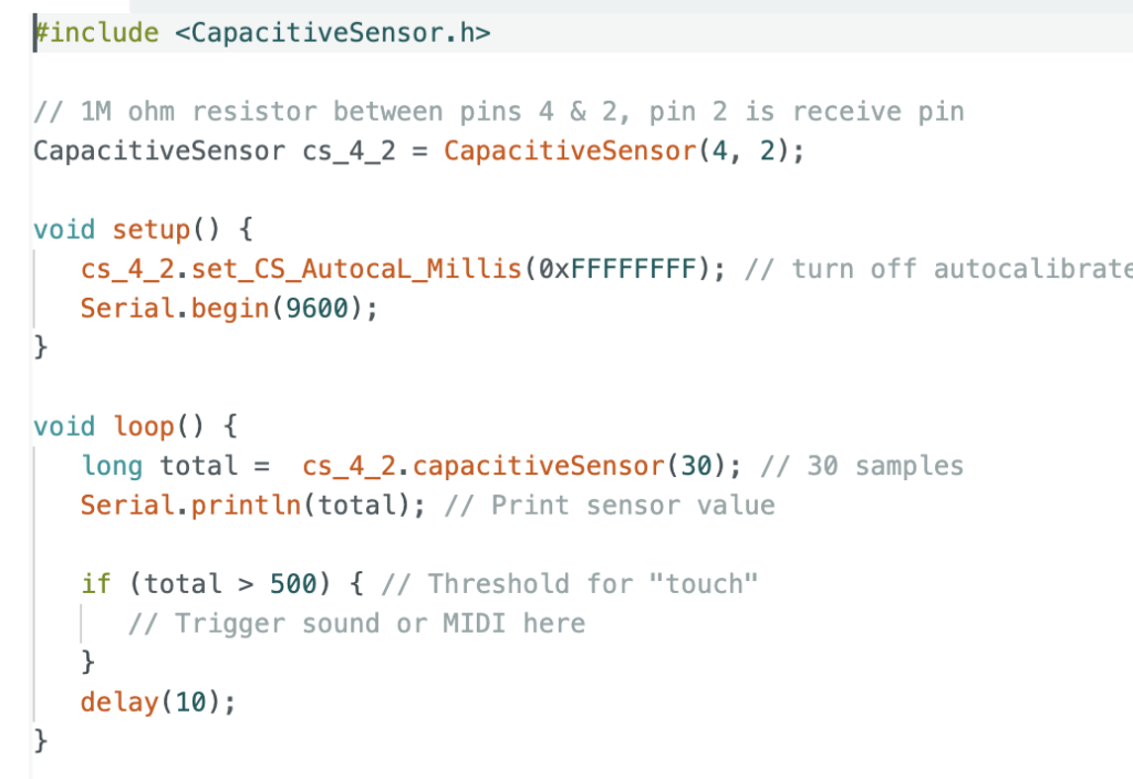 Today I tested two approaches. In the first code, I employed a rather simplistic method: attaching alligator clips to both ends of a guitar string, one end connected to the 5V port and a resistor of approximately 1-10 ohms, the other end grounded. This was simply using `analogRead` to detect High or Low, resulting in readings with significant noise. I realised there exists a more professional approach, particularly well-suited for interactive installations: utilising the CapacitiveSensor library. If memory serves, we covered this library quite some time ago. In any case, I briefly revisited its usage and rewrote the code. The underlying principle remained largely unchanged, except that one end of the crocodile clip now connects to the transmit pin, while the other end requires an additional receive pin instead of being directly grounded. Having obtained some data, this phase of the project could be temporarily concluded.